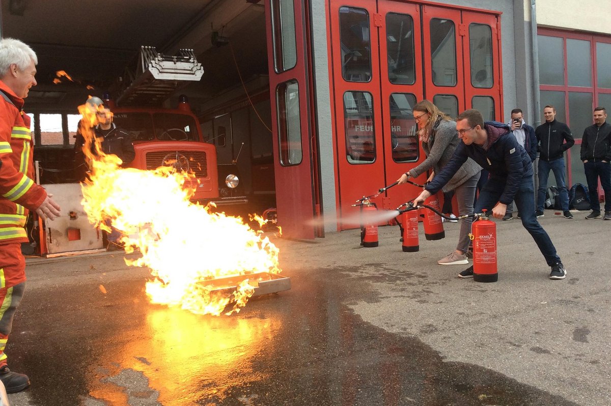 Auf dem Gelände der Freiwilligen Feuerwehr Filderstadt nutzten 16 Studierende sowie Prof. Dr. Jens Bossmann die Chance, unter fachlicher Anleitung des professionellen Feuerlöschtrainers Wolfgang Steck praktische Erfahrungen bei der Brandbekämpfung mit Kleinlöschgeräten sowie bei der Menschenrettung mittels Feuerwehrdrehleiter zu sammeln.