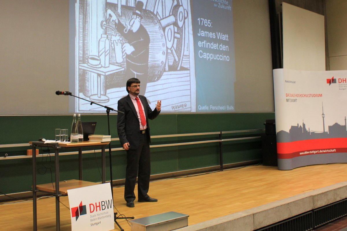 Rund 150 Zuhörerinnen und Zuhörer kamen in das Audimax der Hochschule: Studierende, Beschäftigte, Duale Partner sowie eine interessierte Öffentlichkeit. Dort bot Erik Händeler einen Rück- und Ausblick auf die Entwicklung der Wirtschaft. Auf der Grundlage der Kondratieff-Theorie, der Theorie der langen Strukturzyklen, analysierte er die derzeitige Wirtschaftslage, indem er weit in die Geschichte zurückging. Wer langfristig erfolgreich sein wolle, müsse anders mit Wissen umgehen, so ein Fazit des Vortrags. Denn laut Händeler läge hier die Wertschöpfung von morgen. Hierarchien in Unternehmen, unsere Streitkultur und unser Sozialverhalten müssten sich hierfür verändern. Gesunde Perspektiven gelängen denjenigen Unternehmen, die vertrauensvolles Zusammenarbeiten auf Augenhöhe und transparent gestalteten.
