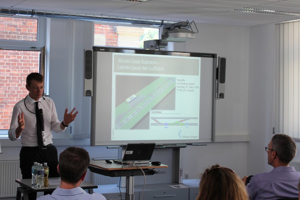 Auch das Thema „Klinisches Risikomanagement“ wurde betrachtet. Dabei definierte Prof. Dr. Jürgen Graf (Klinischer Direktor am Klinikum Stuttgart) zunächst, was klinisches Risikomanagement bedeutet und erörterte dann mit den Studierenden die Frage, was die Medizin aus Industrie und Luftfahrt lernen kann.