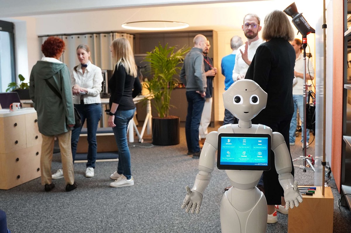Im Rahmen eines Tags der offenen Tür konnten die Gäste das Studio41 und die vielfältigen Möglichkeiten zur digitalen Anreicherung von Lehre aus erster Hand erleben. Bereits am Eingang sorgte der humanoide Roboter Pepper für großes Staunen und zahlreiche Schmunzler, als er die Ankommenden mit Handschlag begrüßte.