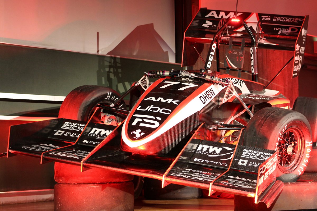 Mit Spannung hatte das Publikum im voll besetzten Audimax auf diesen Moment gewartet: Das rote Tuch wurde feierlich vom nagelneuen schwarz-roten Boliden gezogen und die Studierenden des DHBW Engineering Teams präsentierten ihren Kommilitoninnen und Kommilitonen, Familien, befreundeten Rennteams und der interessierten Öffentlichkeit den eSleek17. Das Team besteht derzeit aus 99 Studierenden verschiedener Fachrichtungen und hat den Elektro-Rennwagen in den letzten acht Monaten gebaut – neben dem normalen Hochschul- und Arbeitsalltag. Die Teams Batterie, Systemelektronik, Fahrdynamik, Chassis, e-Drive, Fahrwerk und Organisation haben an unzähligen Wochenenden und Abenden darauf hingearbeitet, den wettbewerbstauglichen Rennwagen rechtzeitig fertigzustellen. Der eSleek17 kann sich sehen lassen: Er hat 172 PS, Allradantrieb, kann eine Höchstgeschwindigkeit von 130 Stundenkilometern erreichen und ist mit 195 kg ein Leichtgewicht.