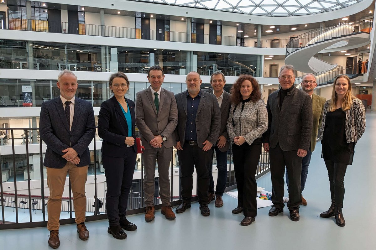 Die Mondragon Unibertsitatea (MU) ist eine gemeinnützige Genossenschaftsuniversität im spanischen Baskenland, die sich über ihre einzigartige Organisationsstruktur und ihre enge Orientierung an den Bedarfen der Wirtschaft auszeichnet. Prof. Dr. Martina Klärle, Präsidentin der DHBW und Prof. Dr. Beate Sieger-Hanus, Rektorin der DHBW Stuttgart, empfingen Vicente Atxa, Rektor der Mondragon Unibertsitatea, Jon Altuna, Akademischer Vize-Rektor und Jon Arrekoetxea, Projektmanager EU4Dual, gemeinsam mit weiteren Professor*innen und Vertreter*innen der DHBW Stuttgart im imposanten Neubau der Fakultät Technik. Nach einem gemeinsamen Austausch über die Studienmodelle beider Universitäten führte Prof. Dr. Harald Mandel, Prorektor und Dekan der Fakultät Technik, die Delegation durch die Labore und Werkstätten der Studiengänge verschiedener Studiengänge, wo Professor*innen und Wissenschaftliche Mitarbeitende Einblicke in den Studienalltag der Theoriephasen boten. Im Anschluss brach die Gruppe zu einem Besuch beim langjährigen Dualen Partner Mercedes-Benz auf, um das Ausbildungszentrum und einen Teil der Fertigung zu besichtigen und so auch die Praxisphasen des dualen Studiums für die Besucher erlebbar zu machen.