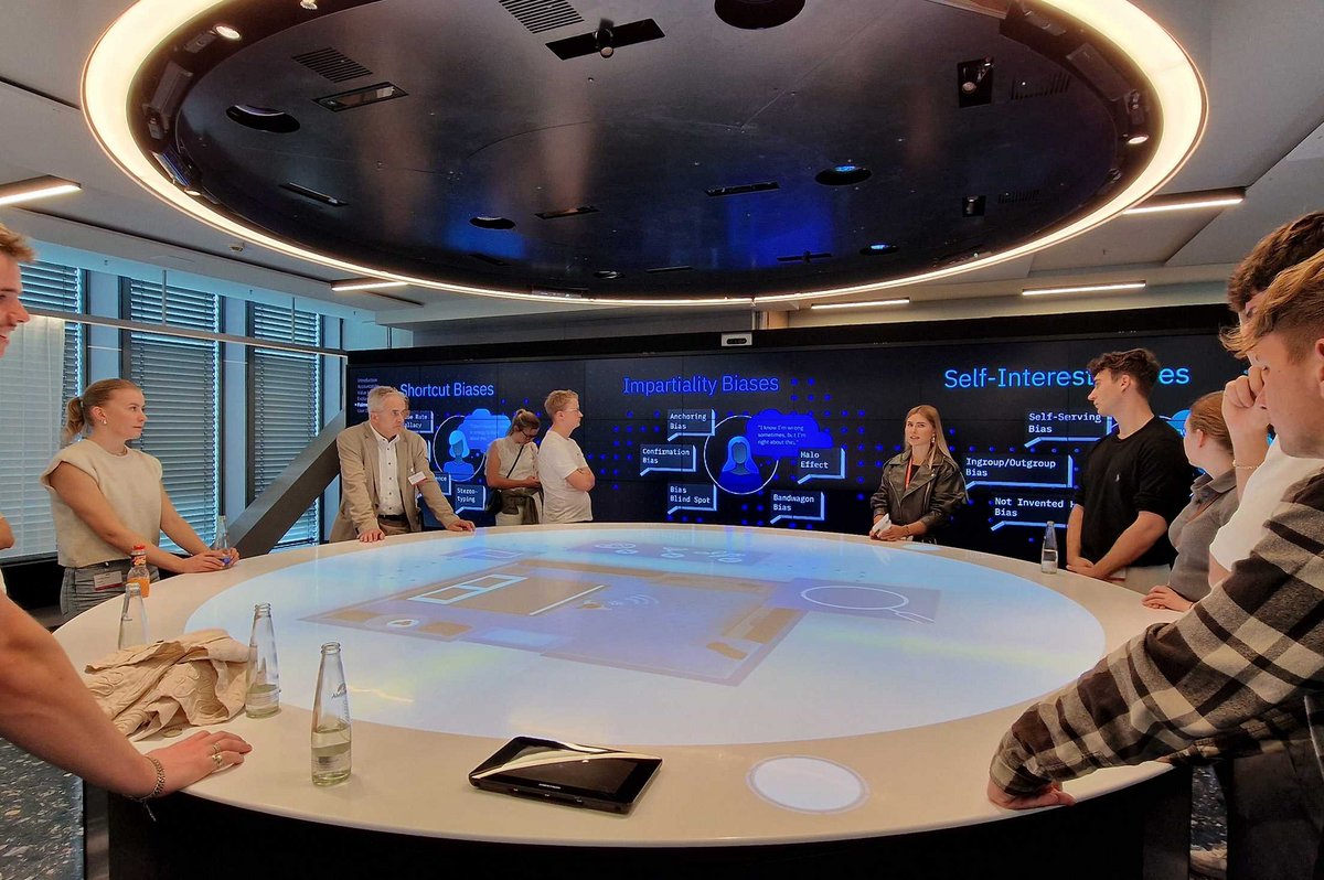 Am nächsten Tag war die Gruppe zu Gast in den beeindruckenden Räumen des IBM Innovation Studios. Nicht nur die tolle Aussicht aus dem 21. Stockwerk hat die Studierenden begeistert – vor allem die Möglichkeiten, die sich durch das Quantum Computing ergeben, haben überzeugt. Über verschiedene Showcases erlebten die Teilnehmenden beeindruckende Einsatzmöglichkeiten der KI im Rahmen von Robotik, Kommunikation und Kundenworkshops.