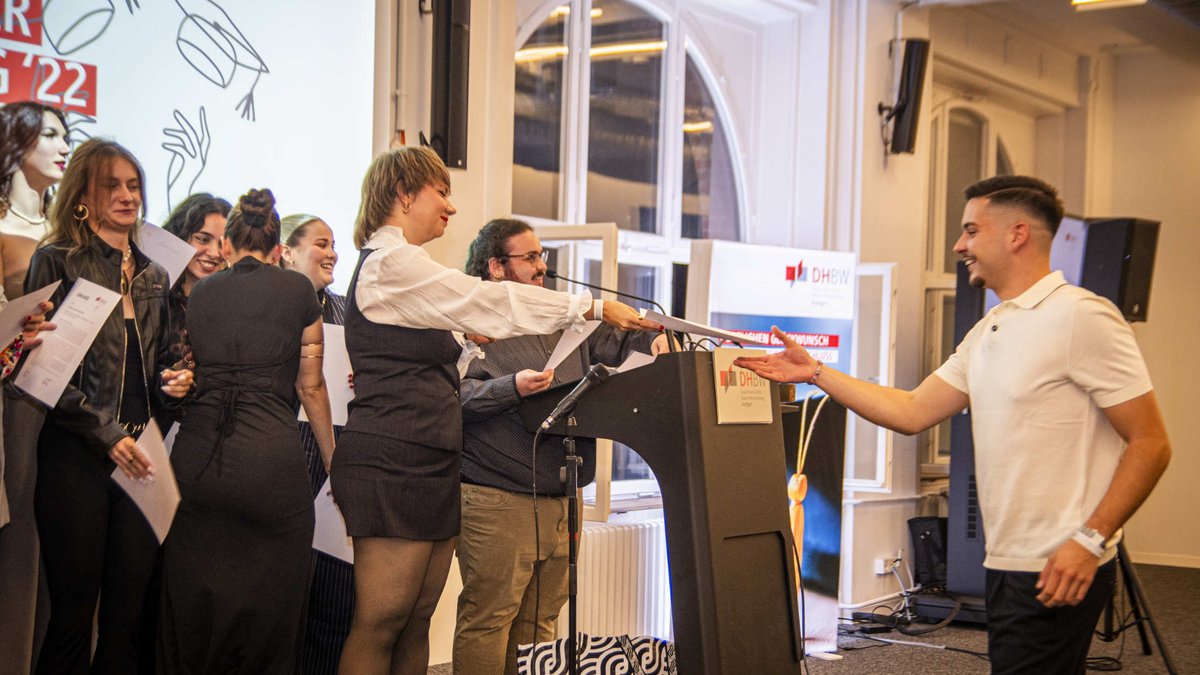 Großen Applaus und Standing Ovations erhielt Susanne Bethancourt Paez, die sich über den mit 300 Euro dotierten Kommunity-Preis des Vereins der Freunde und Förderer der DHBW Stuttgart e.V. freute. Die Laudatio hielt Prof. Dr. Werner Rössle, der sich von den Leistungen der Preisträgerin beeindruckt zeigte. Die StuV-Vertreter*innen Lucy Glück, Anja Kauschalek, Kolya Barth sowie Susanne Bethancourt Paez ehrten darüber hinaus weitere Absolvent*innen, die sich während ihres Studiums für die Hochschule eingesetzt hatten.