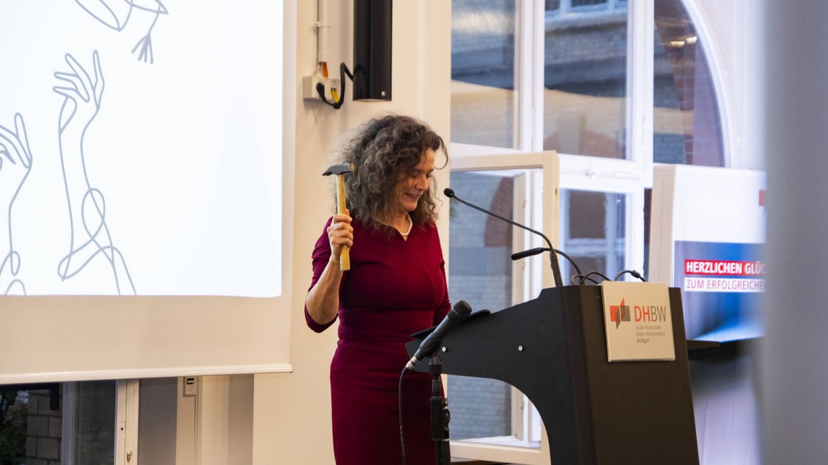 Sagmeister ermunterte in ihrer Rede die Absolvent*innen, für soziale Gerechtigkeit einzustehen und spann dabei den Bogen von der Charta der Menschenrechte über das Grundgesetz bis zum Studium der Sozialen Arbeit an der DHBW Stuttgart.