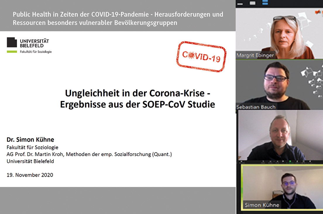 Unter der Leitung von Frau Prof. Dr. Ebinger, Herrn Prof. Dr. Stefan Nöst und Sebastian Bauch (Wissenschaftlicher Mitarbeiter am Studienzentrum Gesundheitsmanagement), diskutierten die über 100 Studierenden zunächst in interprofessionell besetzten Breakout-Sessions, inwiefern sie selbst und welche Bevölkerungsgruppen darüber hinaus besonders stark von der Pandemie betroffen waren. Der Gastvortrag „Gesellschaftliche Folgen der Corona-Pandemie: Erste Erkenntnisse aus der SOEP-CoV-Studie“ von Dr. Simon Kühne (Universität Bielefeld) lieferte als Hintergrund erste Zahlen zu den sozio-ökonomischen Faktoren und Folgen der Verbreitung des Coronavirus in Deutschland.