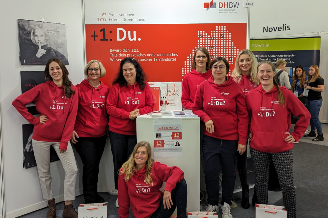 Interessierte konnten sich zudem am Stand der DHBW über den Einstieg als Professorin oder Dozentin informieren. Das Ziel war unter anderem das Recruiting von neuen Dozentinnen und zukünftigen Professorinnen für die Hochschule mit ihren zwölf Standorten. Der DHBW-weite Dozentinnenanteil liegt derzeit bei 27,5 % und der Professorinnenanteil bei 22 %. Das Motto der DHBW auf der herCAREER Expo lautete entsprechend „Eine von 182 Professorinnen +1: Du?“ bzw. „Eine von 3.077 externen Dozentinnen +1: Du?“.