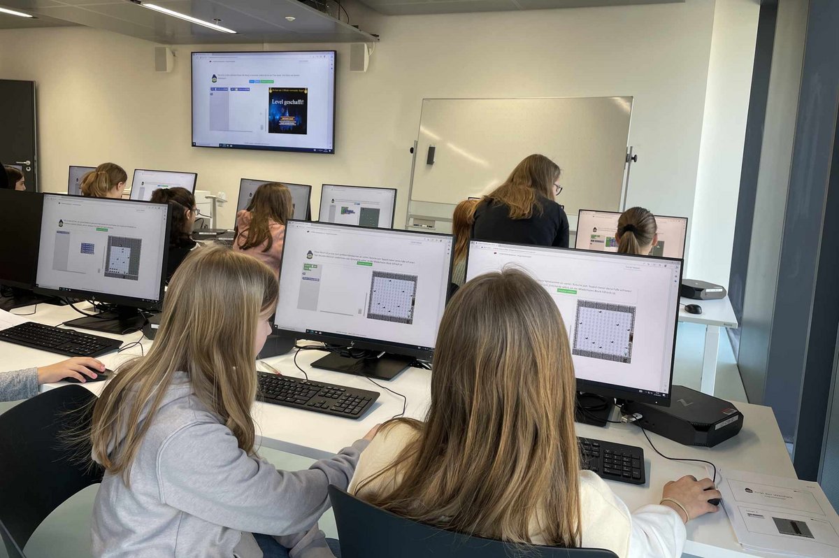Unterstützt durch Informatik-Studentinnen ging es für die Schülerinnen dann darum, ein digitales Kunstwerk zu erstellen und in einem Educational Game zusammen mit einer cleveren Magierin zu lernen, wie man Programme schreibt und damit Rätsel löst. Hier hat die Neugier den Ehrgeiz geweckt, auch knifflige Aufgaben zu lösen und das digitale Kunstwerk in Form eines Mandalas alleine algorithmisch zu verändern.