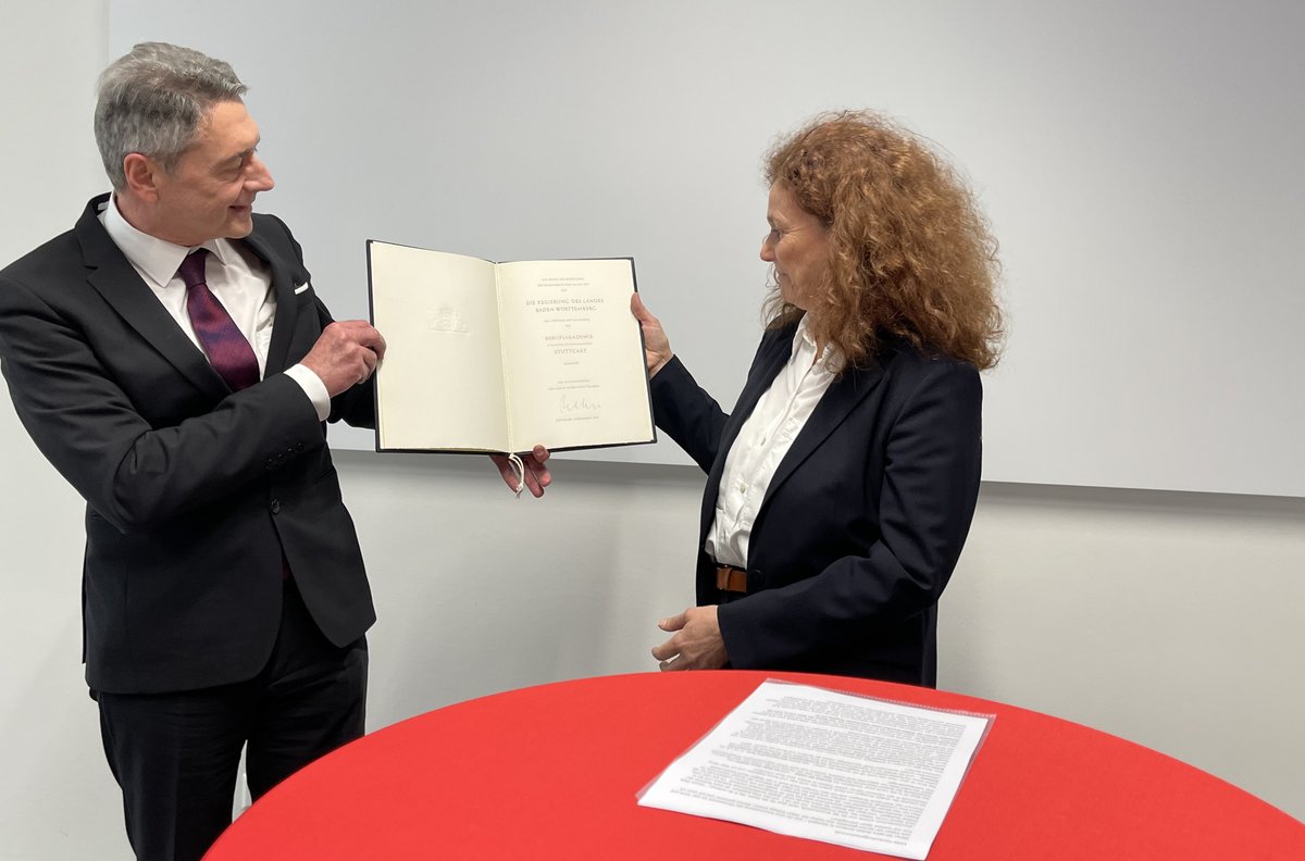 Anschließend übergab Weber symbolisch den Staffelstab an die neue Rektorin Prof. Dr. Beate Sieger-Hanus und überreichte ihr hierzu die Gründungsurkunde der damaligen Berufsakademie von 1974. Sieger-Hanus bedankte sich für das ihr entgegengebrachte Vertrauen und zeigte sich sehr erfreut, im Jahr des 50-jährigen Jubiläums die Leitung der DHBW Stuttgart übernehmen zu dürfen. Ressourcen und Herausforderungen verglich sie mit einem bunten Rosenstrauß, der einerseits durch seine Vielfalt und seinen Duft betört und sich andererseits mit Dornen zur Wehr setzt. In ihrer Vision von der DHBW als attraktivem Ort des Lernens und des Forschens sowie des Wachstums und der Inspiration werden die Herausforderungen durch eine wertschätzende und konstruktive Zusammenarbeit gemeinsam bewältigt. Mehr zur Vision von Rektorin Sieger-Hanus lesen Sie im Interview.