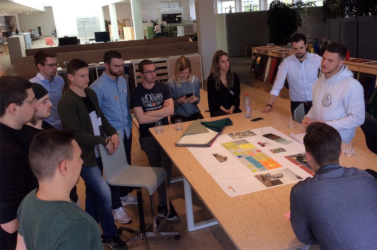 Im Anschluss hatten die Studierenden die Chance, ihre eigenen konzeptionellen Fähigkeiten im Rahmen eines Workshops auszutesten. In drei Gruppen entwickelten sie für drei verschiedene potenzielle Auftraggeber Arbeitsplatzwelten mittels Zonierung, Prozessabläufen, eines Moodboards sowie eines dezidierten Materialkonzeptes für das jeweilige Szenario und erläuterten diese anschließend.
