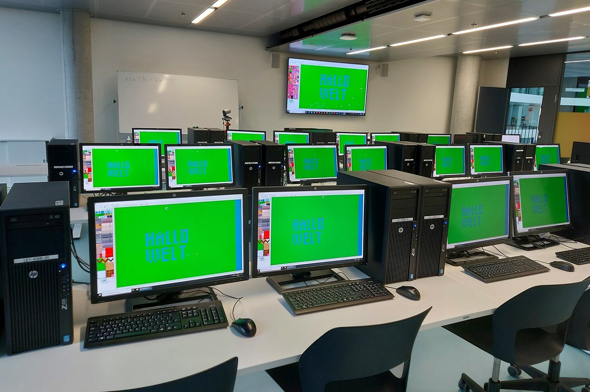 Schließlich ging es noch in die Vorlesung „Wie funktioniert ein Videospiel?“. Nach einer kurzen Einführung in die Geschichte und Technologie der Videospiele durfte selbst Hand angelegt werden. Im Leveleditor entstanden kreative, individuelle Welten, die mit selbstprogrammierten Nichtspielercharakteren bevölkert wurden. Ein so großer Spaß, dass so manches Kind trotz Keksen und Brezeln die Pause übersprungen hat.