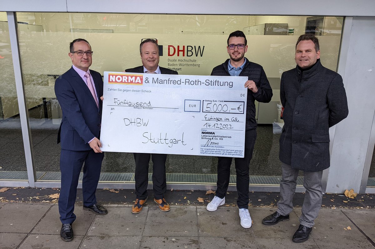 Mitte Dezember wurde der Betrag durch Frank Baderschneider, Niederlassungsleiter des NORMA Zweigbetriebs Eutingen, an Prof. Dr. Dirk H. Hartel (Studiengangsleitung) und Thorsten Ottmüller (Geschäftsführer des Vereins der Freunde und Förderer der DHBW Stuttgart e. V.) offiziell übergeben.