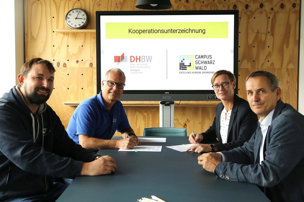 Bereits im Januar 2022 war die DHBW Stuttgart Campus Horb im Rahmen des „Arbeitskreises Industrielle Digitalisierung“ (AKID) auf Wunsch der Kooperationsunternehmen zu Besuch am Campus Schwarzwald. An diesem Termin wurden erste Themen und Projekte für eine engere Zusammenarbeit besprochen. Denn sowohl Stefan Bogenrieder, Geschäftsführer des Campus Schwarzwald als auch Prof.in Antje Katona, Leiterin des Campus Horb waren sich von Beginn an einig, dass eine Vernetzung der beiden Campus im Bereich der Lehre und Forschung insbesondere für die Studierenden einen großen Mehrwert mit sich bringt. „Was uns an der DHBW fehlt, ist hier am Campus Schwarzwald vorhanden. Wir bieten unseren Studierenden bereits ein ausgezeichnetes Bachelorstudium an – hier sind wir stark. Durch die Partnerschaft können wir unseren Studierenden auch Perspektiven aufzeigen, wie der Weg nach dem Bachelor weitergehen kann“, bestätigte Prof. Dr. Harald Mandel, Dekan der Fakultät Technik an der DHBW Stuttgart das gemeinsame Vorhaben während der Vertragsunterzeichnung.