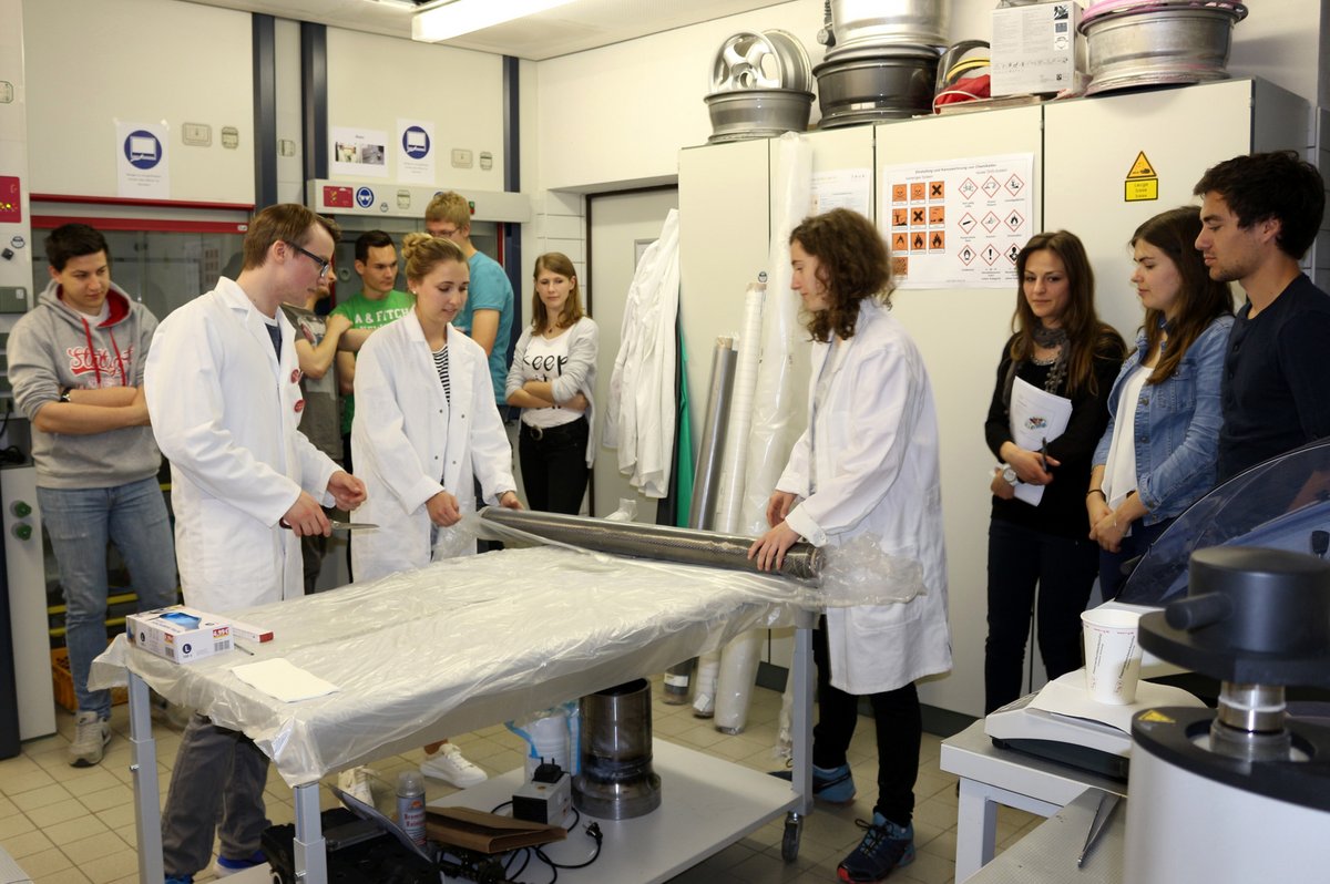 Nach einer theoretischen Einführung zu dem angewandten Verfahren, der Vakuuminfusion, konnten die Studierenden unter Anleitung des wissenschaftlichen Mitarbeiters Tom Kurdewan im Labor selbst Hand anlegen. Durch das Zuschneiden und Drapieren verschiedener Halbzeuge wurden zunächst Kenntnisse über die Handhabung verschiedener Web- und Gelege-Arten der Kohlenstoffasern vermittelt. Beim Vorbereiten der Werkzeugoberfläche und der Verbrauchsmaterialien sowie beim Anrühren des Harzes konnte eindrucksvoll gezeigt werden, welche Herausforderungen das Verfahren zur Herstellung hochwertiger Bauteile mit sich bringt.