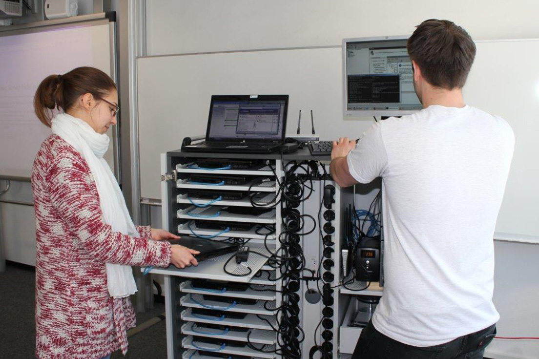 Die Idee zum Notebookwagen kam Prof. Heuser, um den Studierenden im Fach „Computernetzwerke und IT-Sicherheit“ die sinnvolle Ergänzung des theoretischen Teils durch Übungen zu ermöglichen. Aus Sicherheitsgründen kam die bestehende PC-Systemlandschaft des Studiengangs dafür nicht in Frage. „Die Idee reifte schnell, dass wir diverse Notebooks und einen Server anschaffen mussten, um zusammen mit entsprechender Netzwerkinfrastruktur ein Firmennetzwerk simulieren zu können“, berichtet Prof. Heuser. Zwei IT-Dienstleister aus der Region, GKS IT-Services mbH in Salach sowie die Stuttgart ansässige Firma Data Connect, unterstützten das Projekt.