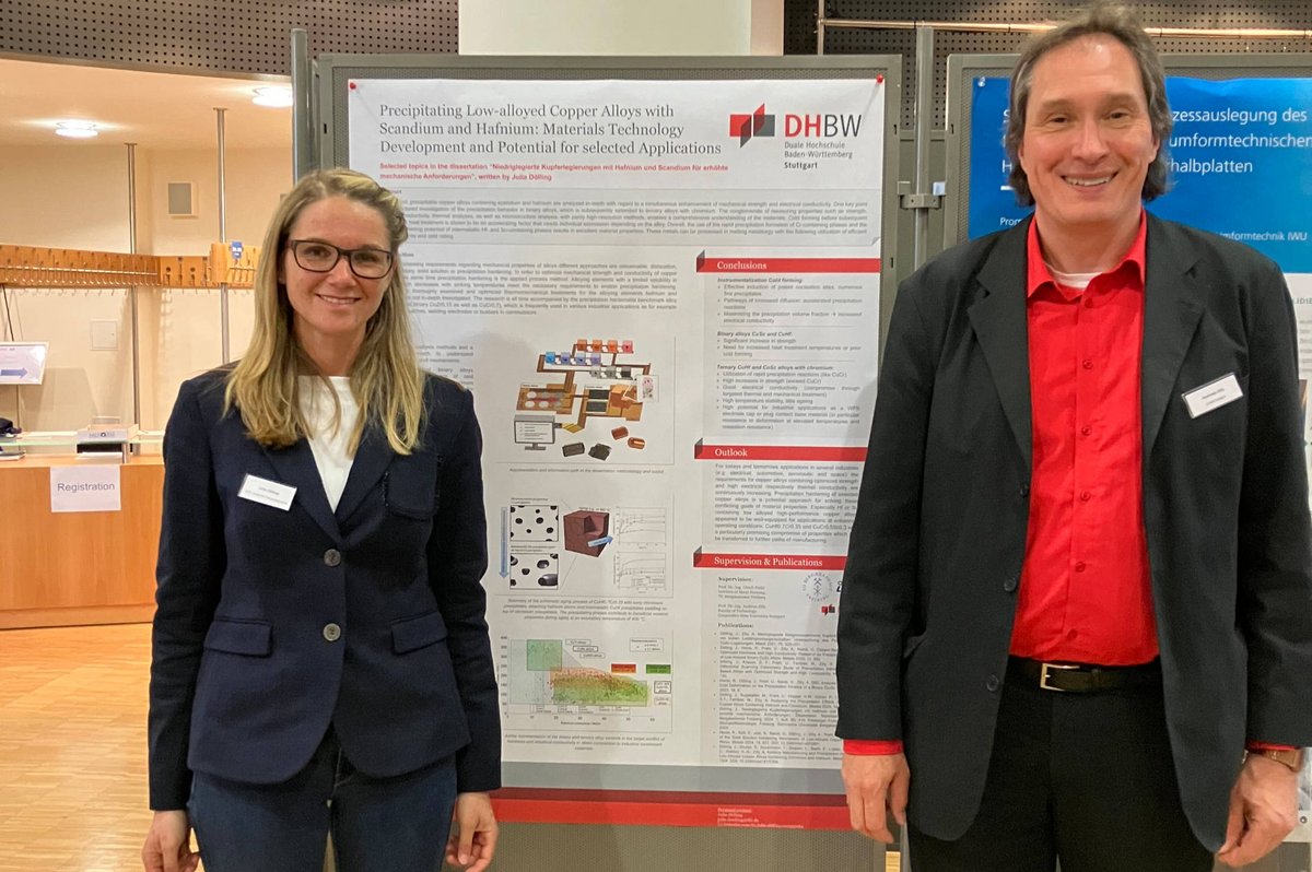 Dölling stellte die Ergebnisse ihrer Dissertation zum Thema „Niedriglegierte Kupferlegierungen mit Hafnium und Scandium für erhöhte mechanische Anforderungen“ der Fachjury und im Rahmen der MEFORM Konferenz 2025 des Instituts für Metallformung (IMF) einem Fachpublikum bestehend aus rund 150 Anwesenden in Form eines Kurzvortrages vor. Zusätzlich nahm sie an einer Poster-Ausstellung teil, bei der sie sich gemeinsam mit ihrem DHBW-Betreuer Prof. Dr.-Ing. Andreas Zilly den Fragen der Teilnehmerinnen und Teilnehmern widmen und wertvolle Kontakte für weitere Forschungsaktivitäten knüpfen konnte.