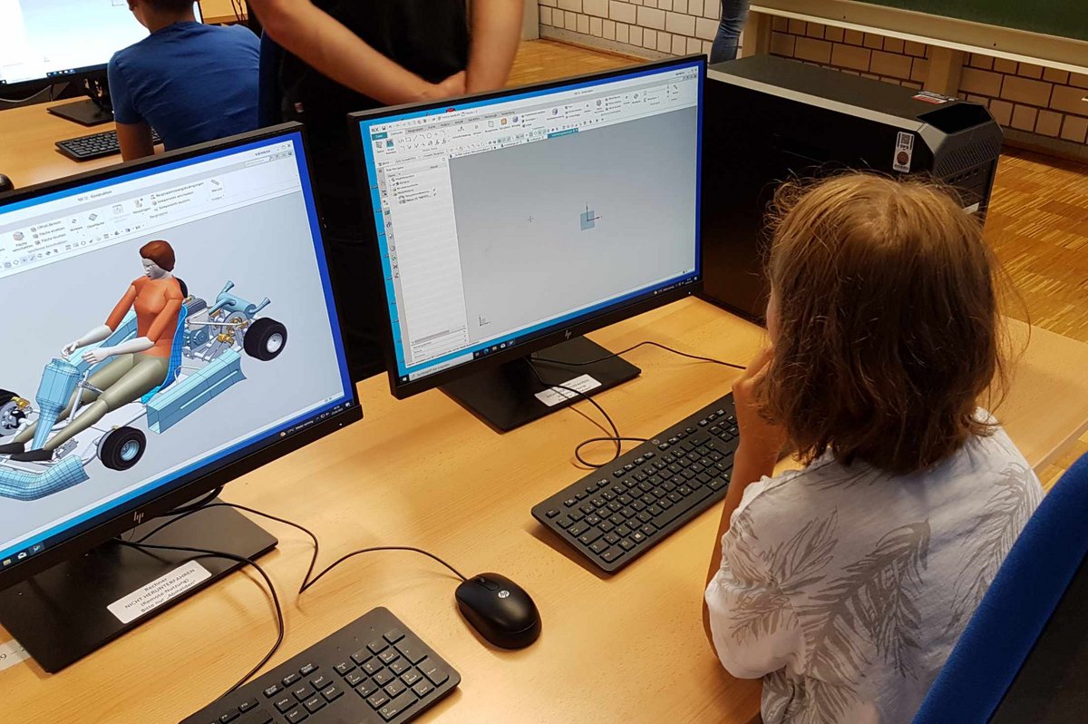 Bereits seit 2006 lädt die Fakultät Technik in der Regel zwei Mal im Jahr zu diesem Schnuppertag in die Hochschule ein, um spielerisch für Technikthemen zu begeistern. Nach über zweieinhalb Jahren pandemiebedingter Pause konnte nun endlich wieder eine Gruppe Schüler*innen im bewährten Workshop erste Schritte in einem professionellen CAD-Programm erproben. Sie konstruierten am Computer ein Lenkrad plus Verbindungsstück und Lenkstange und setzten die Bauteile zum Schluss in ein bestehendes CAD-Modell eines Gokarts ein.