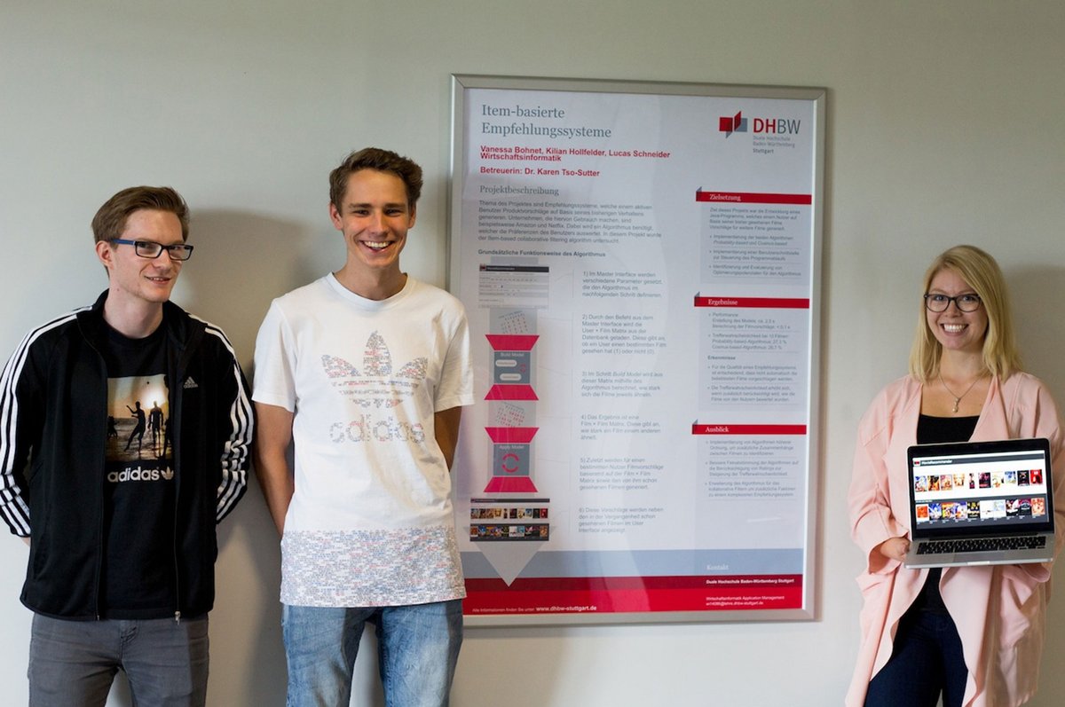 Um das Engagement der Studierenden zu honorieren lobte der Verein der Freunde und Förderer der DHBW Stuttgart einen Preis für das beste Poster aus. Von der Jury wurde das Team bestehend aus Vanessa Bohnet, Lucas Schneider und Kilian Hollfelder mit drei Amazon-Gutscheinen belohnt. In der von Dr. Karen Tso-Sutter betreuten Arbeit "Item-basierte Empfehlungssysteme" beschäftigten sie sich mit der Methode des Collaborative Filtering. Dabei werden Kundinnen und Kunden passende Objekte aufgrund eines Ähnlichkeitsmaßes vorgeschlagen. Als konkreter Anwendungsfall wurde ein Algorithmus implementiert, der Nutzerinnen und Nutzern Kinofilme vorschlägt, die ihnen gefallen könnten.