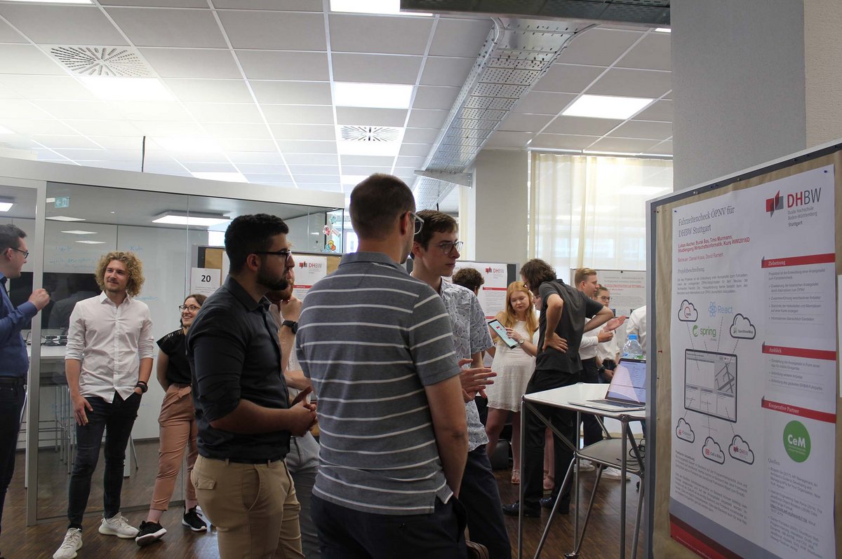 Unter dem Leitthema „Connected Mobility - Potenziale und Technologien vernetzter Mobilitätslösungen“ bearbeiteten je drei Studierende eine spezifische Fragestellung und stellten ihre Ergebnisse im Rahmen einer Poster-Präsentation vor. Die Fragestellungen kamen von den beteiligten Unternehmen Bosch, Capgemini, Daimler, MHP, NTT DATA, Porsche, Sparkassen-Versicherung sowie USU AG/unymira. Erstmals war die DHBW Stuttgart in den Räumlichkeiten der Stuttgart Connectory im Wilhelmsbau zu Gast. Dieser von der Robert Bosch GmbH betriebene „co-creation space“ bietet eine moderne, offene Arbeitsumgebung zur Förderung von Innovationen und Austausch – also eine ideale Umgebung für Studierende.