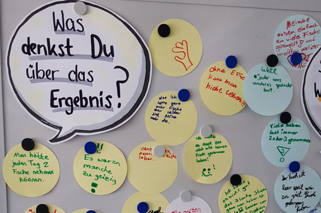 Die Schülerinnen und Schüler aus der Sekundarstufe haben sich spielerisch mit Nachhaltigkeitsstrategien beschäftigt. Dabei schlüpften sie in die Rolle von Fischenden an einem See und konnten in mehreren Runden entscheiden, wie viel sie angeln wollen. "Wo ist denn hier der Haken?" fragte eine Schülerin gleich nach dem Briefing zum Planspiel. Dass der Haken nicht nur an der Angel ist, wurde spätestens nach der dritten Spielrunde klar: Der See war überfischt und die Klasse musste eine Strategie zum nachhaltigen Umgang mit knappen gemeinsamen Ressourcen finden. Durch die Simulation wurden die Themen Nachhaltigkeit und Allmendegüter für alle Teilnehmenden erlebbar und der Spaß kam natürlich auch nicht zu kurz.