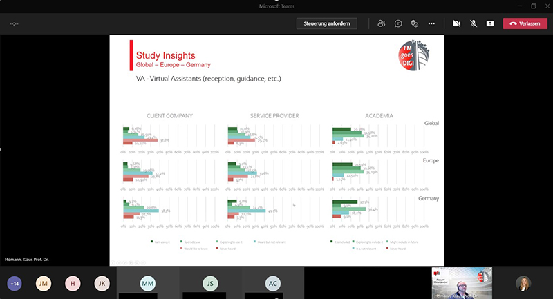 Mitte Juli 2021 wurden die Studienergebnisse auf der virtuellen GEFMA Professorenkonferenz vorgestellt. Die Professor*innen beschäftigen sich innerhalb der Arbeits-Plattform unter anderem mit zukunftsrelevanten Themen sowie deren sinnvolle Implementierung in die Studiengänge auf Basis des GEFMA-Standards 610. Herr Prof. Dr. Homann präsentierte die globalen, europäischen und regionalen Ergebnisse einzelner besonders auffälliger Technologien und stellte sie dem Stand der Integration digitalisierungsbezogener Themen in den europäischen "FM-Lehrplan" gegenüber. Der Austausch mit Professoren verschiedener Universitäten und Hochschulen aus Deutschland, Schweiz, Österreich und Luxemburg ermöglichte eine weitere interessante Sichtweise auf digitale Lehr- und Lerninhalte in FM-Studiengängen.