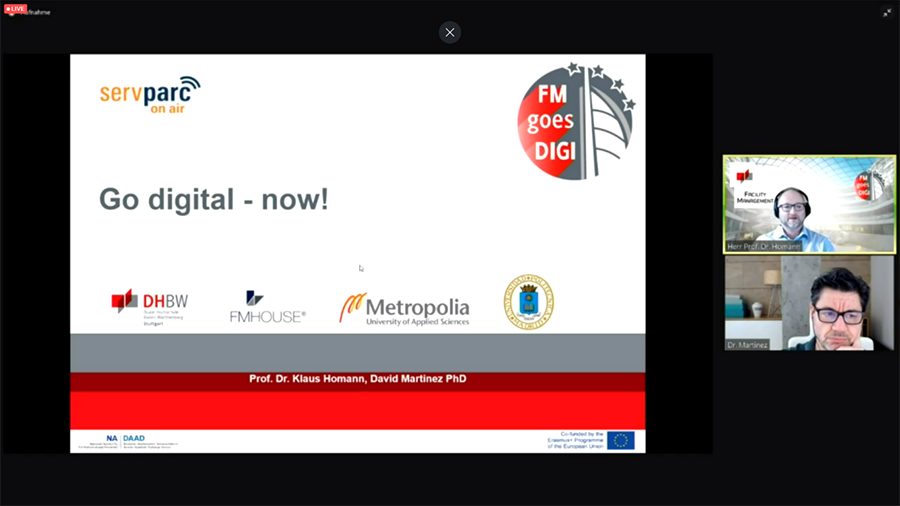 Auf der digitalen Konferenz für Innovationen und Trends im Facility Management wurden die Studienergebnisse unter dem Titel „Go digital - now! Gain insights from a „global“ study, what technologies will drive the future of Facility Management and what skill sets will be needed to survive!“ präsentiert und anschließend diskutiert. Die ServParc ist der Branchen-Hotspot für Facility Management, Industrieservice und IT-Lösungen, weshalb die Teilnahme und Präsentation des Projektes besonders wertvoll war. Insgesamt nahmen knapp 600 Personen teil, von denen sich laut Pressemeldung der Veranstalter, rund 80% zum Thema Digitalisierung informierten, 60% zum Thema Nachhaltigkeit, 33% zum Thema New Work und je 23% zu den Themen Risikomanagement und FM im Bereich der öffentlichen Hand.