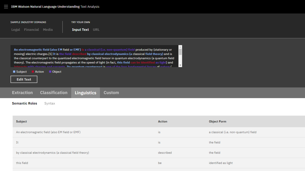 In dieser NLU Demo kann der Benutzer einen selbstgewählten Text analysieren lassen und es werden Metadaten wie Konzepte, Entitäten, Schlüsselwörter, Kategorien, Empfindungen, Emotionen, Beziehungen, semantische Rollen und Syntax extrahiert und mit einer Konfidenz assoziiert.
