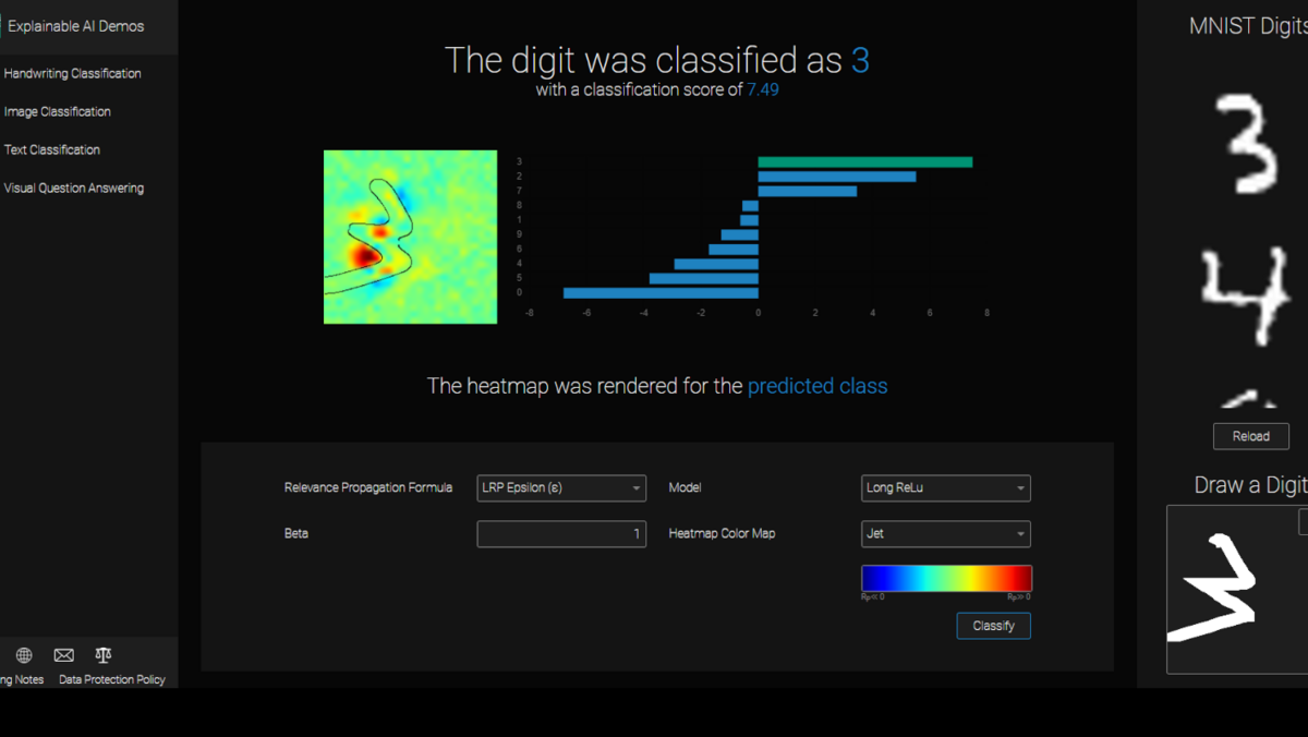 Anwendungsszenario: Die Benutzer*innen zeichnen eine Zahl und wählen Modellarchitekturen, Parameter und Heatmap aus, damit diese nach dem MINIST Datensatz erkannt werden.