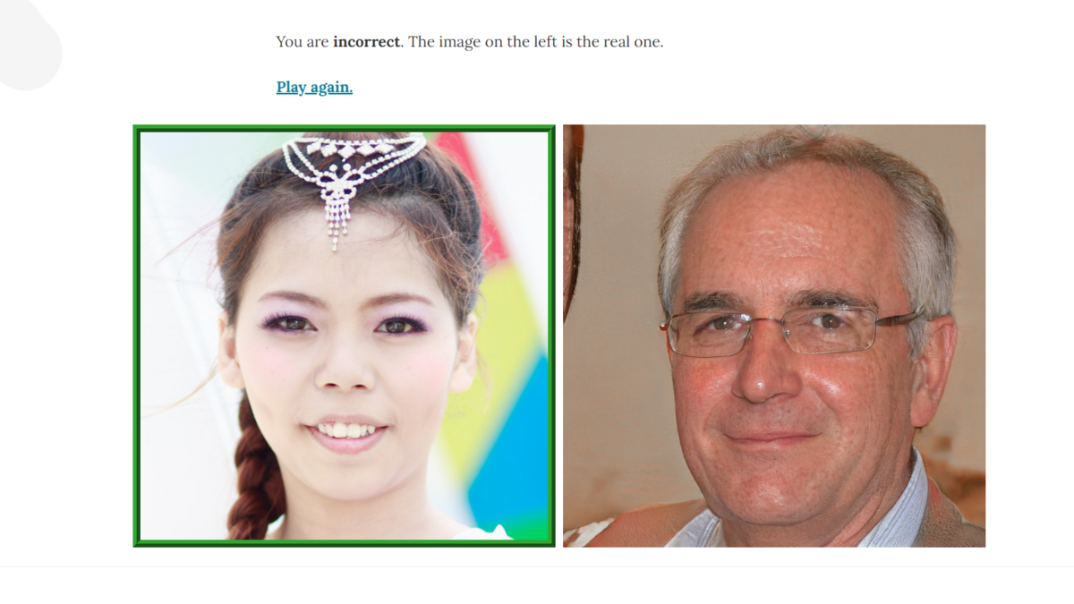 Die Benutzer*innen sollen zwischen einem echten und einem künstlichen von der KI generierten Gesicht unterscheiden. Anschließend wird die richtige Lösung gezeigt.