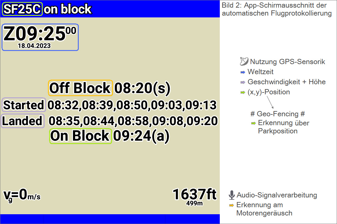 Die Erkenntnisse und Basistechnologien aus den früheren Arbeiten lassen sich gut auch auf andere Anwendungsgebiete übertragen. Ein neues, passendes - weil bislang wenig beforschtes - Feld ist der Bereich des Sport- und Privatflugs. Augenmerk der aktuellen F&E ist eine Arbeitsentlastung von Pilotinnen und Piloten im Privat- und Sportflug. Fest im Flugzeug eingebaute technische Komponenten und Assistenzsysteme unterliegen sehr hohen Normanforderungen. Es ist aber durchaus möglich und üblich, zusätzliche Hilfsmittel wie Smartphone-Apps einzusetzen. Zurzeit befinden sich Tools in der Entwicklung, die die gesetzlich vorgeschriebene genaue Protokollführung der Flugbewegungen am Boden und beim Starten und Landen weitgehend automatisiert (Bild 2). Dadurch wird die Cockpitarbeit gerade in kritischen Betriebsphasen entlastet. Zur Einhandbedienung wurden spezielle UI-Konzepte entworfen, für die Erkennung des Fluggeräts und damit seiner Leistungsparameter sowie seiner Bewegungsaktivitäten werden GPS-Positionierung und Mustererkennung auf das Motorengeräusch eingesetzt.