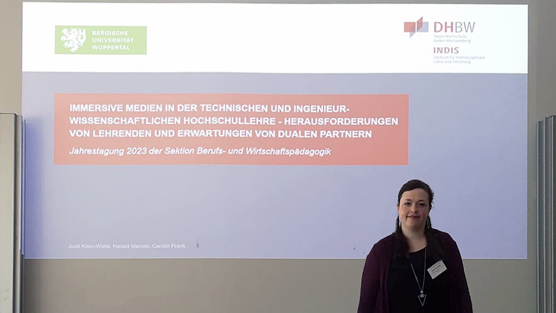 Die Jahrestagung 2023 der Sektion Berufs- und Wirtschaftspädagogik (BWP) der Deutschen Gesellschaft für Erziehungswissenschaft fand dieses Jahr an der Europa-Universität Flensburg statt. Das Rahmenthema „Freiheit · Berufsbildung · Verantwortung“ bot Wissenschaftler*innen aus der Berufs- und Wirtschaftspädagogik Gelegenheit zum regen Austausch, und auch die DHBW Stuttgart war mit einer Präsentation vertreten. Die wissenschaftliche Mitarbeiterin Judit Klein-Wiele präsentierte den aktuellen Stand ihres kooperativen Promotionsvorhabens unter dem Titel „Immersive Medien in der technischen und ingenieurwissenschaftlichen Hochschullehre – Herausforderungen von Lehrenden und Erwartungen von Dualen Partnern" im Young Researcher Programm.