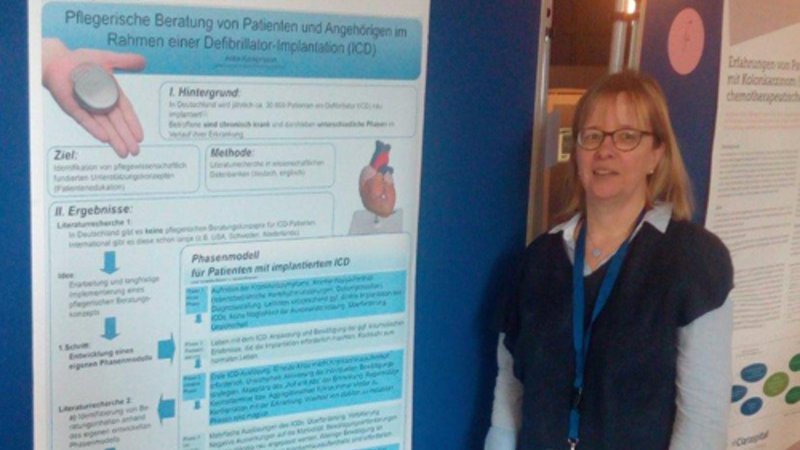 Über zwei aufeinander aufbauende Projektarbeiten hatte sie die folgenden Forschungsfragen bearbeitet und beantwortet: Ist eine Schulung und Beratung für Patienten nach Erstimplantation eines Defibrillators sinnvoll? Könnte das eine pflegerische Aufgabe sein? Welche Inhalte sollte eine pflegerische Beratung für Patienten und Angehörige im Rahmen einer Defibrillatorimplantation enthalten? Dass diese Thematik für die betroffenen Patienten und ihre Angehörigen sehr relevant und notwendig ist, hat Frau Kampmann aufgrund ihrer langjährigen Berufserfahrung als Krankenschwester erkannt. Dass sie ihre Ergebnisse am Kongress Forschungswelten vorstellen konnte, bestätigt zusätzlich den Forschungsbedarf und die Relevanz der Thematik. Sehr motiviert wird sie nun auch im Rahmen ihrer bevorstehenden Bachelorarbeit weiter an dem Thema arbeiten.
