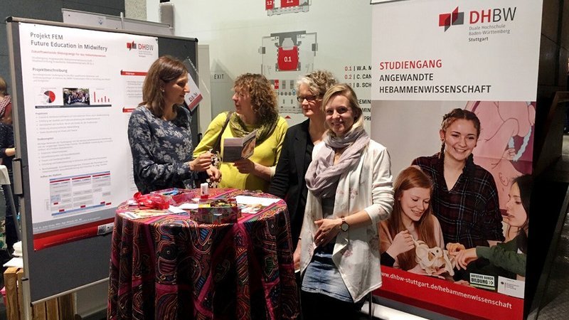 Andrea Bosch und Sonja Wangler, wissenschaftliche Mitarbeiterinnen im Projekt FEM (Future Education in Midwifery) der DHBW Stuttgart, präsentierten mit tatkräftiger Unterstützung durch die Studentinnen Miriam Jubitz und Miriam Skowronek das Studienprogramm für examinierte Hebammen.