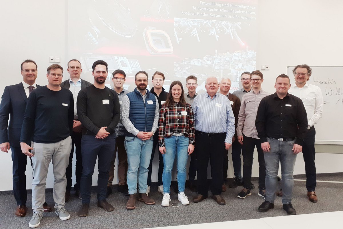 Der anschließende Betriebsrundgang veranschaulichte den vorgestellten Fertigungsprozess direkt am Entstehungsort des Produkts. Sehr deutlich erklärt wurde die Herstellung von Steckverbindungen, die eine Kombination aus Kunststoff- und leitfähigen Metallbauteilen darstellen. Weiter wurde den Teilnehmenden erläutert, wie wichtig beim Spritzgießprozess eine dem Material angepasste Wärmezu- und abfuhr zur Erzielung qualitativ hochwertiger Kunststoffteile ist und welche Möglichkeiten zum Verbund zwischen Metall und Kunststoff bestehen.