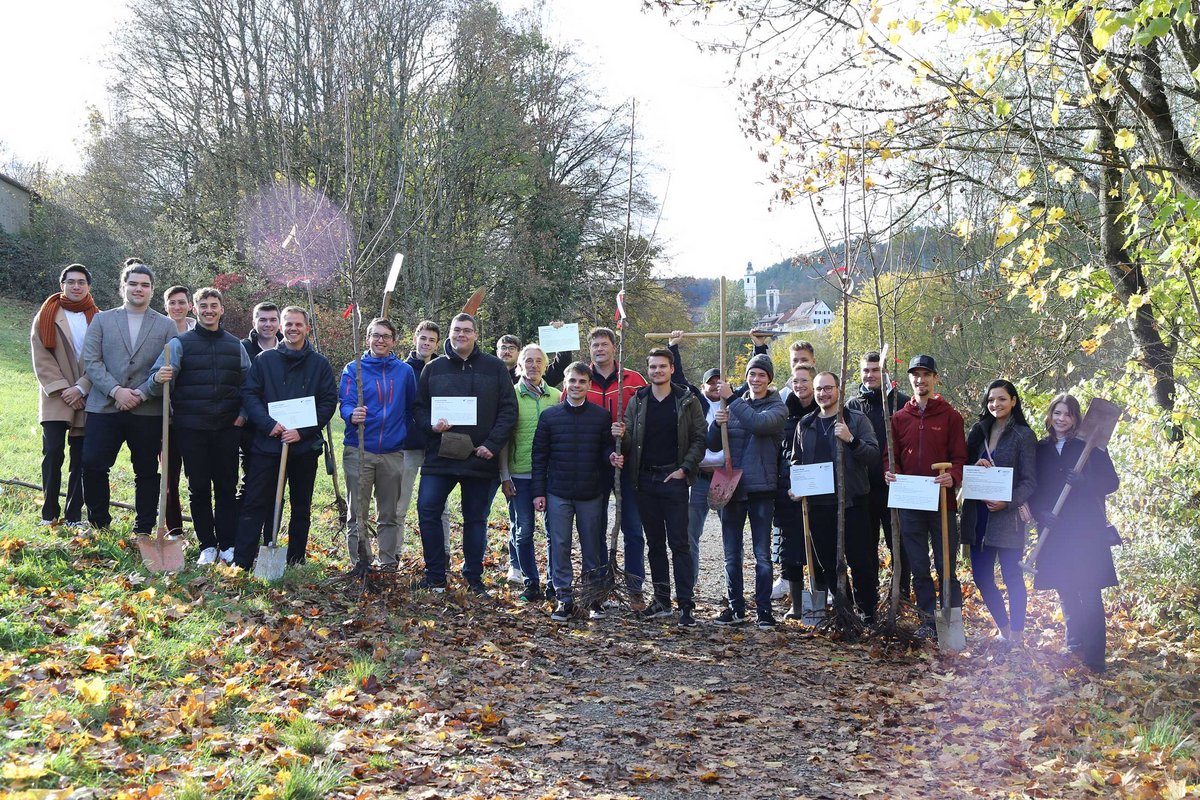 Eines der Projekte, die aus dem Wettbewerb hervor ging, ist die Entstehung eines Alumni-Waldes mit alten Obstbaumsorten. Auf einer von der Stadt zur Verfügung gestellten Wiese wurden im letzten Jahr die ersten drei Obstbäume gepflanzt. Nun haben sich in diesem Jahr einige Vertreterinnen und Vertreter von sieben Kursen getroffen, um den Alumni-Wald bzw. die Streuobstwiese zu erweitern und ihre Bäume zu pflanzen - als Besondere Erinnerung und als Zeichen der Verbundenheit mit der Stadt Horb. Auch Oberbürgermeister Peter Rosenberger (Schirmherr des Wettbewerbs) und Prof.in Antje Katona (Leiterin des Campus Horb der DHBW Stuttgart und Schirmherrin des Wettbewerbs) ließen sich es nicht nehmen, um zu der Pflanzaktion zu kommen.