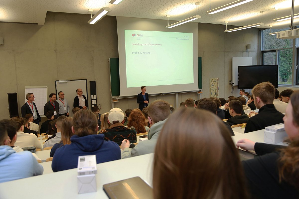 Mit 166 neuen Studierenden war das Audimax voll besetzt. Sie wurden offiziell von der Campusleiterin, Prof.in Antje Katona, begrüßt, die allen einen erfolgreichen Start ins duale Studium und in den neuen spannenden Lebensabschnitt wünschte. In Vertretung des Oberbürgermeisters hieß der Wirtschaftsförderer der Stadt Horb, Dejan Micic, die Erstsemester in der Stadt willkommen. Mit einer kurzen Vorstellung der Stadt betonte er auch die Vorteile der Wirtschaftsregion Horb. Auf die offiziellen Grußworte folgten die Willkommensworte und die Vorstellung des Teams der Studiengangsleitungen mit vielen Antworten rund um die Organisation des Studiums und den Campus.