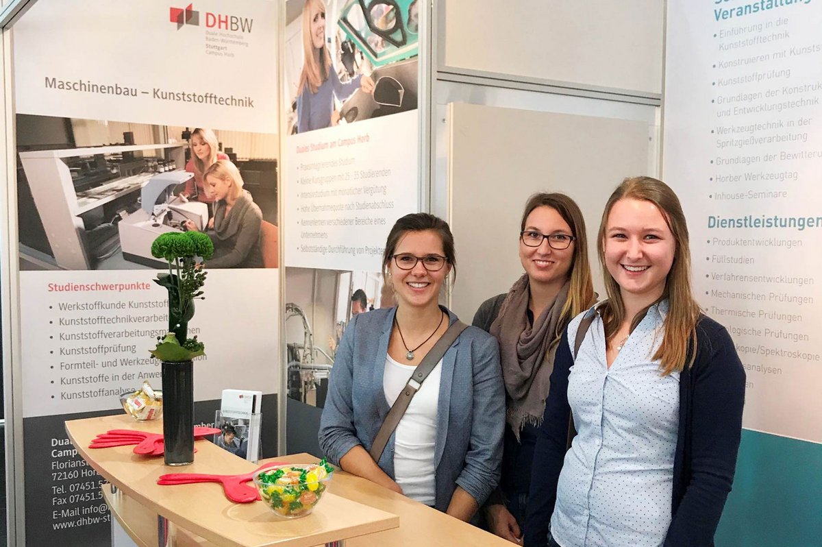 Auch dieses Mal war wieder der Campus Horb der DHBW Stuttgart mit einem eigenen Stand in Halle A2 vertreten. In Zeiten des allgemeinen Fachkräftemangels bietet die DHBW die Möglichkeit, junge Nachwuchskräfte zu werben, regional auszubilden und frühzeitig in die Praxis einzubinden. Diese Chance wird von mittelständischen Unternehmen gerne wahrgenommen.