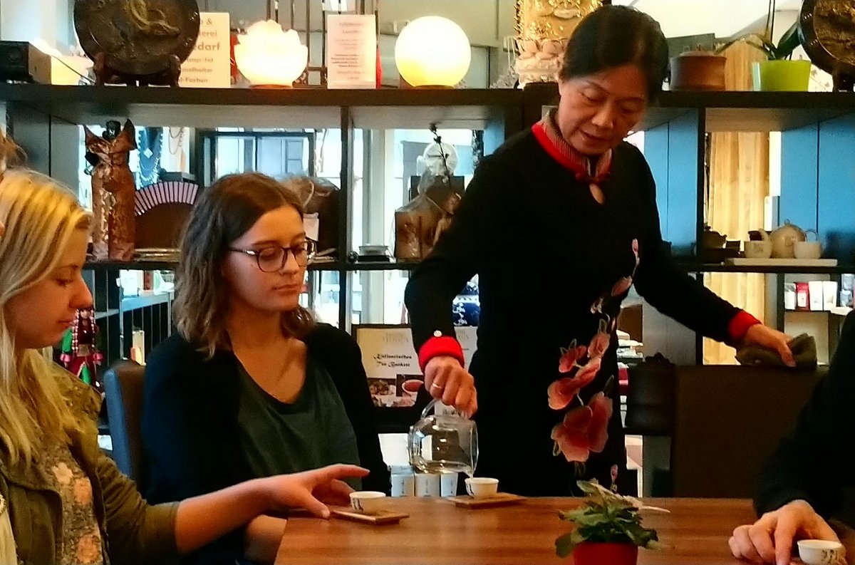 Im Rahmen einer traditionellen Tee-Zeremonie der Gelehrten, bei der die Kunst der Zubereitung und der Genuss im Vordergrund stehen, bereitete sie für die anwesenden Studierenden unterschiedliche Tees durch mehrfaches Aufgießen in kleinen Kännchen zu und erklärte dabei die Besonderheiten der Teeherstellung und worauf man beim Teegenuss achten sollte.