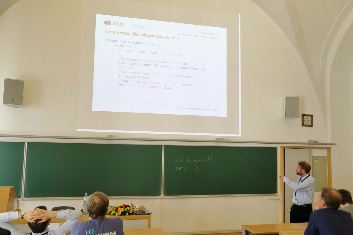 Danach ging es nach Prag zur 14. International Conference on Managed Languages & Runtimes (ManLang 2017). Der Campus Horb war mit einem Vortrag zum Thema „Introducing Scala-like function types into Java-TX” von Plümicke und einer Posterpräsentation von Stadelmeier zum Thema “Java without wildcards“ vor Ort vertreten. ManLang ist die Nachfolgekonferenz der Principles and Practices of Programming on The Java Platform (PPPJ), die Plümicke 2013 in Stuttgart veranstaltete. Seither ist er Mitglied im Steuerungskreis der Tagungsreihe.