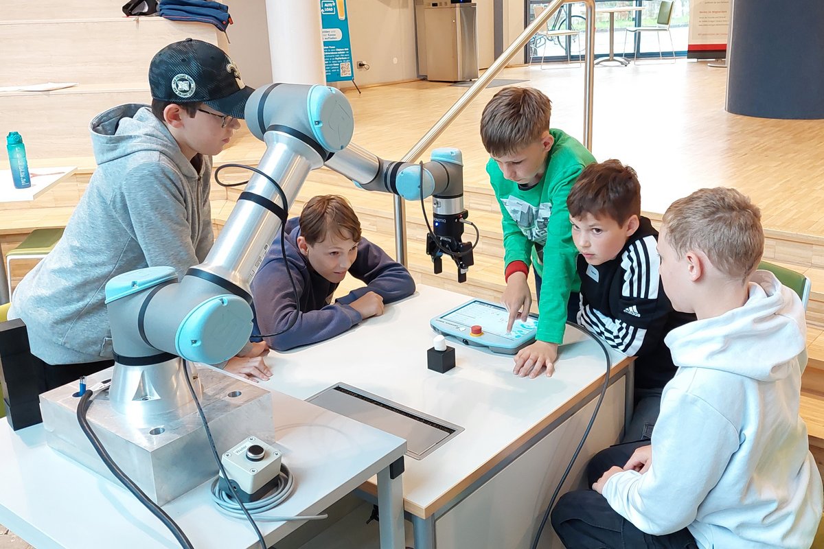 Im Mittelpunkt stand ein kollaborativer Roboter der Firma Universal Robots, der spielerisch programmiert werden konnte. Zunächst erstellten die Teilnehmerinnen und Teilnehmer einfache Bewegungsprogramme, bevor es an praktische Aufgaben ging: Mit dem Greifer des Roboters wurden Würfel und sogar Marshmallows aufgenommen und bewegt. Anschließend kam der integrierte Kraftsensor zum Einsatz, um Stapelaufgaben zu meistern. Auch die eingebaute Kamera wurde genutzt – die Kinder trainierten den Roboter darin, Objekte zu erkennen und in einer Erkennungsfläche selbstständig aufzunehmen.