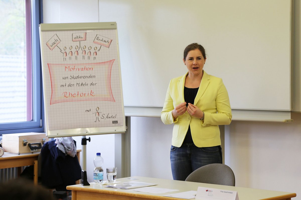 Im Zweiten Seminar „Wach, aktiv, kritisch: Motivation von Studierenden mit den Mitteln der Rhetorik“ veranschaulichte Seminarleiterin Sarah Andiel, wie die Lehrenden die Leistungsfähigkeit und Motivation der Studierenden positiv beeinflussen können. Anhand der Diskussion von Fallbeispielen, einem praktischen Methodentraining sowie einer Feedback- und Reflektionsrunde wurden die Möglichkeiten zur aktivierenden Vermittlung von Lehr- und Lerninhalten aufgezeigt.