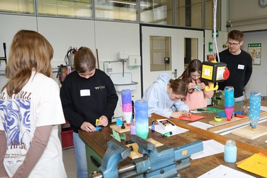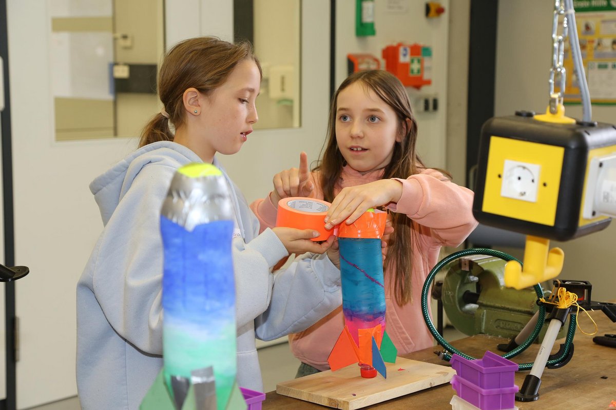 Auch die Maschinenbaulabore wurden von den Mädchen erobert. Hier nahm eine Gruppe am Motorenprüfstand zunächst ein Auto mit all seinen Funktionen genauer unter die Lupe, um dann gemeinsam zu überlegen, wie das Auto der Zukunft aussehen könnte. Ausgestattet mit VR-Brillen - VR steht für Virtual Reality - ging eine andere Gruppe auf Entdeckungsreise in virtuelle, also künstliche Welten. Spielerisch konnten sie erfahren, welche Rolle VR in der Technik spielt. Ein anderes Maschinenbaulabor wurde zum Weltraumbahnhof umfunktioniert. Hier wurden Wasserstrahlraketen aus leeren Plastikflaschen gebaut, die am Ende ihre ersten Startversuche absolvierten. Wie vielseitig Metalle sein können und wie man aus dem Nichts Kunststoffanhänger zaubern kann, erfuhr eine Gruppe von Schmuckdesignerinnen, die ihre selbst gefertigten Armbänder mit nach Hause nehmen durften.