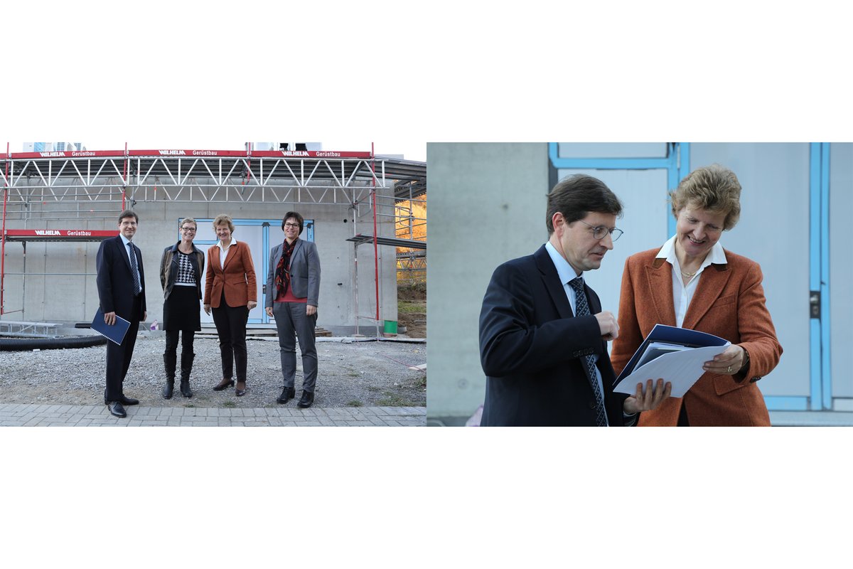 Auf dem Programm stand der alljährliche Austausch mit den Mitarbeiterinnen und Mitarbeitern in Horb. Diese berichten aus ihrer Arbeit, können aber auch Fragen und persönliche Anliegen direkt mit der Kanzlerin klären. Ein weiterer Tagesordnungspunkt war in diesem Jahr die Besichtigung des neuen Laborgebäudes für Diagnosetechnik. Bei dem Rundgang erläuterten Prof. Dr. Hartmuth Diery, Leiter des Campus, Annette Appenzeller, Verwaltungsleiterin, und Prof. Antje Katona, Studiengangsleiterin im Maschinenbau, den aktuellen Baufortschritt. Die Fertigstellung des Baus hatte sich etwas verzögert, aber, so Prof. Katona, „die gute Nachricht ist, dass wir die Räume bald beziehen und das Labor größtenteils noch in diesem Jahr in Betrieb nehmen können“.