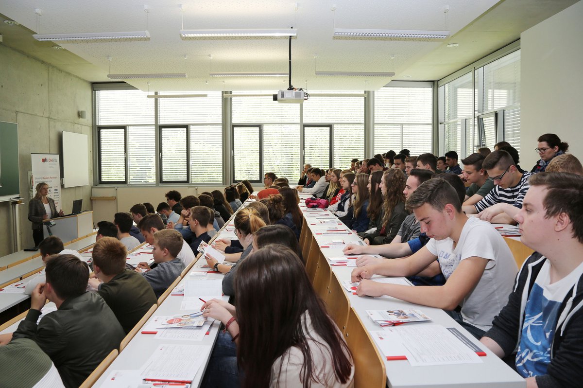 In der Einführungsveranstaltung erfuhren sie zunächst, was das duale Studium an der Dualen Hochschule Baden-Württemberg ausmacht und welche Besonderheiten und Unterschiede es zu anderen Hochschularten gibt. In einer anschließenden Fragerunde berichteten drei Studierende von ihren Erfahrungen und standen den Gästen Rede und Antwort. Besonders interessiert waren die Besucher vom Ablauf des Bewerbungsprozesses bei den Unternehmen und wie die Studierenden den Unterschied von Praxis- und Theoriephasen erleben.