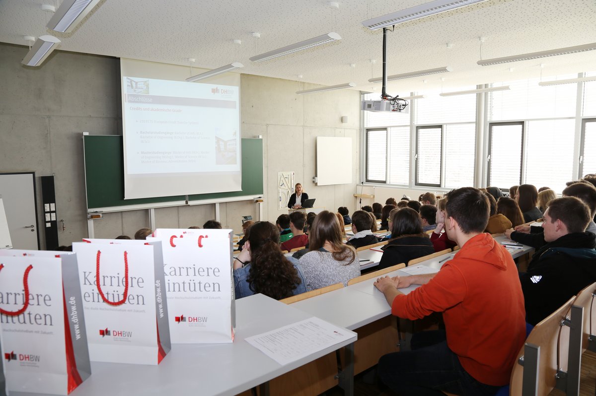 Zunächst informierte Andrea Rohrer, Leiterin der Allgemeinen Studienberatung und Hochschulkommunikation, über Besonderheiten und Anforderungen eines dualen Studiums. Denn nicht nur das Studienfach sondern auch der Hochschultyp muss zu den persönlichen Neigungen und Interessen passen. In einer anschließenden Fragerunde standen die Studentinnen Jessica Faißt (Maschinenbau), Nadine Hermann und Salome Renz (beide Wirtschaftsingenieurwesen) den Interessierten Rede und Antwort und berichteten ausführlich über ihre Erfahrungen als dual Studierende.