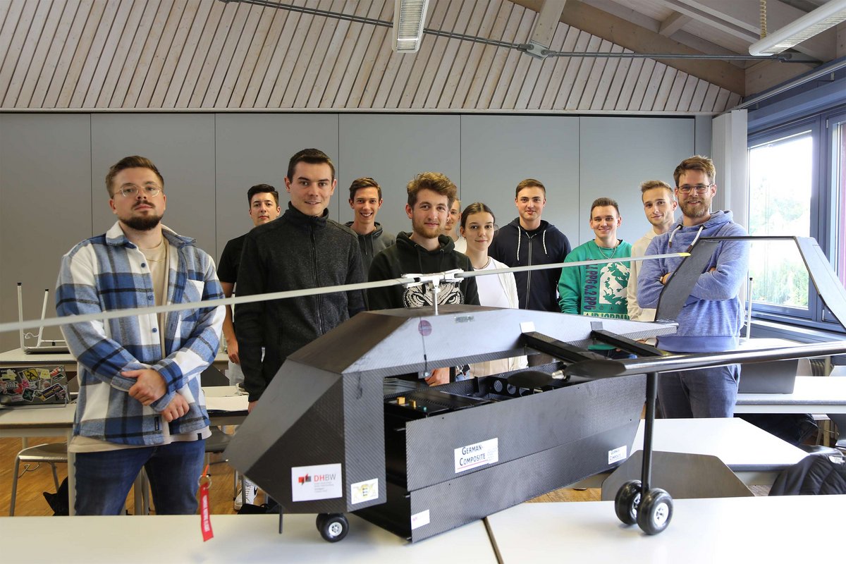 Die Studierenden haben im Vorfeld fleißig geforscht, gerechnet, konstruiert und schließlich eine fertige Drohne zusammengebaut. Nils Maiero, Student beim Dualen Partner German Composite, hat die Drohne im Rahmen einer Studienarbeit konstruiert. „Die Formstabilität hinzubekommen war dabei die größte Herausforderung“, so Maiero. Die Leichtbaukonstruktion besteht aus Platten, die zusammengeklebt und innen verstärkt wurden. Als Material wurde ein Faserverbundstoff auf Flachsbasis gewählt. „Dieser ist etwas besser recyclebar als beispielsweise Carbon“, so Prof. Wolf Burger, der das Forschungsprojekt betreut.