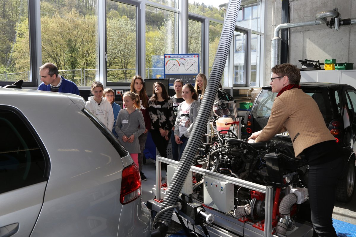 Nach dem Laborrundgang ging es dann an den praktischen Teil des Tages. In drei Gruppen wurde gebastelt und gelötet, dabei war jede Menge Fingerspitzengefühl gefragt. Mit Hilfe von Drähten und Kabeln wurde ein Teelicht zum Leuchten gebracht. Eine andere Gruppe beschäftigte sich beim Bau eines Solar-Mini-Rennwagen mit der Zukunftstechnologie Solarstrom. Der Rennwagen kann bei ausreichendem Sonnenschein mit Solarstrom fahren, ansonsten fährt er batteriebetrieben. Dies wurde auch in der Abschlussrunde freudig unter Beweis gestellt. Die dritte Gruppe wurde von Prof. Antje Katona in die Technik des Autos eingeführt. Bevor es an den Bau eines kleinen Elektroautos ging, bekamen die Mädchen demonstriert, was innerhalb eines Motors geschieht, wie aus Kraftstoff Bewegung entsteht und wie der Antrieb der Zukunft aussieht.