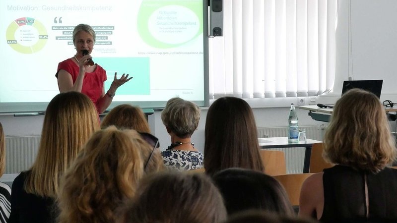 Ein Vortrag der Studierenden (Timo Burkhardt, Teresa Löffler, Lara Braun) befasste sich anschließend mit den vielfältigen Erfahrungen und den Ergebnissen im Forschungsprozess. Das Thema „Gesundheitskompetenz“ wurde darüber hinaus durch die interessanten Beiträge von zwei Gastrednerinnen aufgegriffen. Privatdozentin Dr. Ute Mons vom Deutschen Krebsforschungszentrum -Stabsstelle Krebsprävention sprach über die „Krebsprävention als gesamtgesellschaftliche Aufgabe – das Beispiel Tabakentwöhnung“. Simone Schmidt-Goretzky (M.Sc. Gesundheitsökonomie), Sozial- und Gesundheitsplanerin im Gesundheitsamt Stuttgart, stellte das Programm „MeinPlan Stuttgart - Gesundheitskompetenzvermittlung in Bezug auf die Arzneimitteltherapie - Eine Maßnahme aus der kommunalen Gesundheitskonferenz der Landeshauptstadt Stuttgart“ vor.