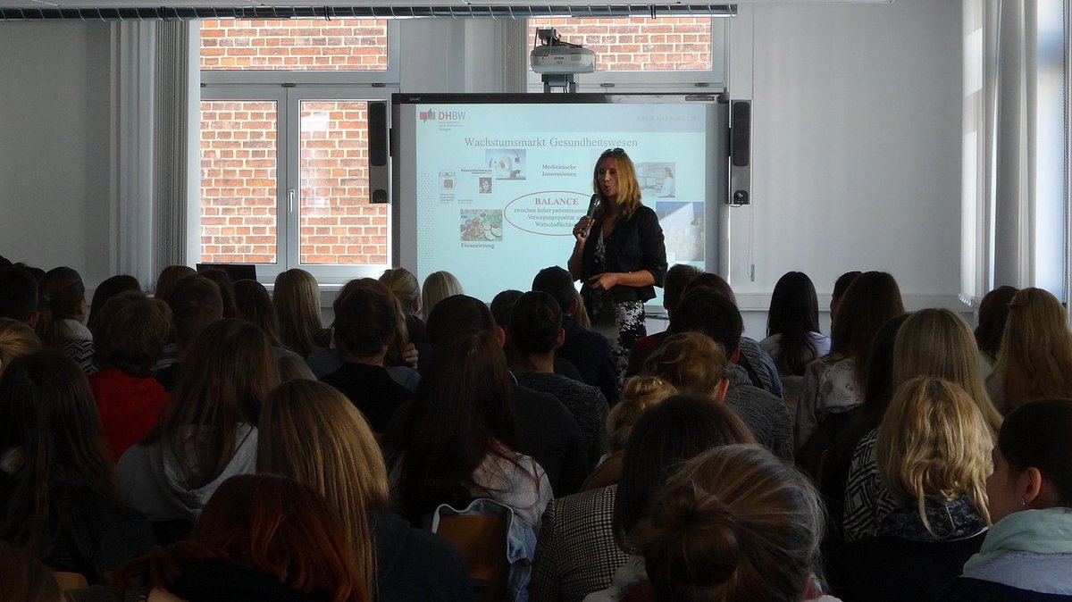 Am ersten Tag des neuen Studienjahres versammelten sich 167 Studienanfängerinnen und Studienanfänger des Studienzentrums Gesundheitswissenschaften und Management im Audimax der DHBW Stuttgart. Im Rahmen der traditionellen Begrüßungsvorlesung hieß Studiendekanin Professorin Anke Simon die neuen Studierenden willkommen und stimmte sie mit zukunftsweisenden Gedanken auf die bevorstehende Studienzeit ein.