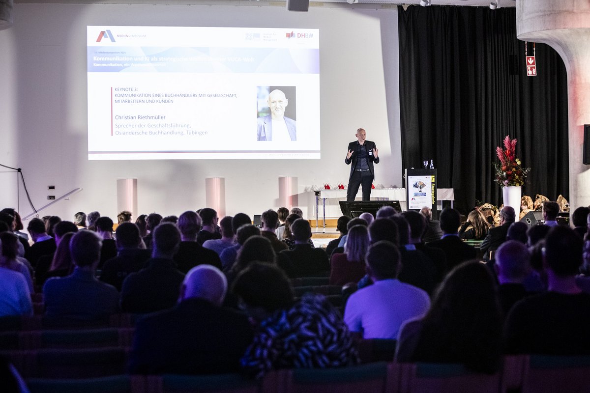 Am 24. November fand das mittlerweile 19. Mediensymposium des Zentrums für Medienmanagement (ZMM) der DHBW Stuttgart in der Staatsgalerie Stuttgart statt. Die Veranstaltung zum Leitthema „Kommunikation und KI als strategische Waffen in einer VUCA-Welt“ war mit rund 400 Teilnehmenden vor Ort ausverkauft und wurde zusätzlich von zahlreichen Zuschauern im internationalen Livestream verfolgt.